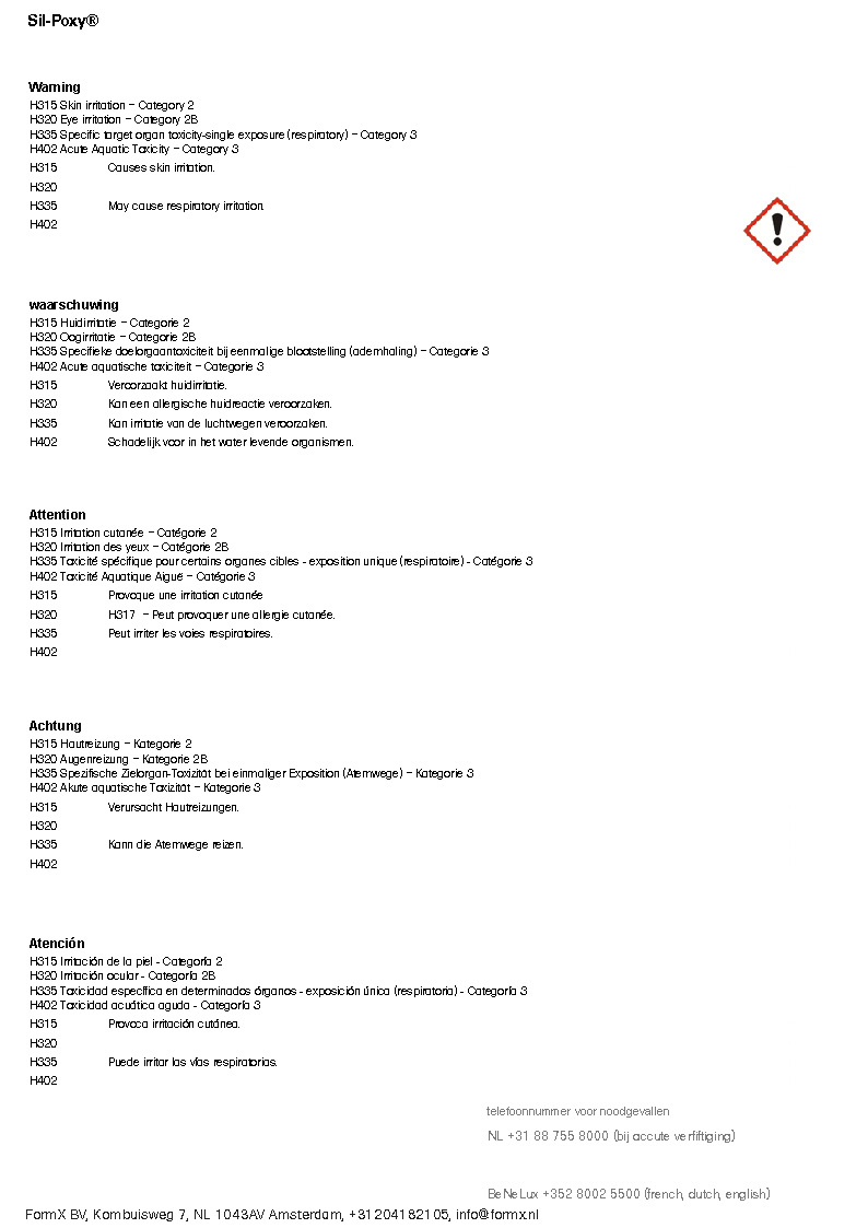 Sil-Poxy © es un adhesivo mono componente fabricado específicamente para pegar caucho de silicona RTV con silicona o con otros soportes como algunos plásticos de uretano, cerámica, tejidos, etc. Sil-Poxy © se puede utilizar con siliconas de estaño y de platino. Una vez curado proporciona una unión fuerte y flexible de silicona entre las dos partes. Sil-Poxy © se puede utilizar para reparar moldes rotos de caucho de silicona. Otras aplicaciones pueden ser la unión de silicona en prótesis y animatrónicos. Tiempo de curado 12 minutos.