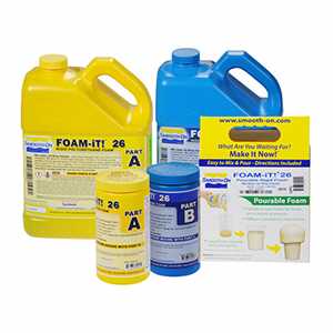La serie FOAM-iT! ™ de Smooth-On son espumas rígidas de dos componentes de agua que son versátiles y fáciles de usar. Los productos FOAM-iT! ™ están disponibles en densidades de 3 libras, 4 libras, 5 libras, 8 libras, 10 libras, 15 libras o 26 libras por pie cúbico. Las partes A y B se miden y se mezclan en cantidades iguales por volumen. Luego, la mezcla se vierte en un molde u otra forma (aplique un agente desmoldante si es necesario). La mezcla se expandirá muchas veces el volumen original (dependiendo del producto FOAM-iT! ™ que esté usando) y desarrollará una estructura celular uniforme. FOAM-IT! ™ 26 deja de ser pegajoso en aproximadamente 4 - 6.5 minutos, desarrolla fuerza de manipulación en 20 minutos y cura por completo en 2 horas. Todos los productos FOAM-iT! ™ se pueden utilizar como material de fundición recta, material de relleno para fundiciones huecas (añade resistencia estructural) o como material de encapsulación, etc. Se pueden pigmentar con color con SO-Strong ™, UVO ™ o IGNITE ™ colorantes y se utilizan para una variedad de aplicaciones de arte / artesanía, diseño industrial y efectos especiales.