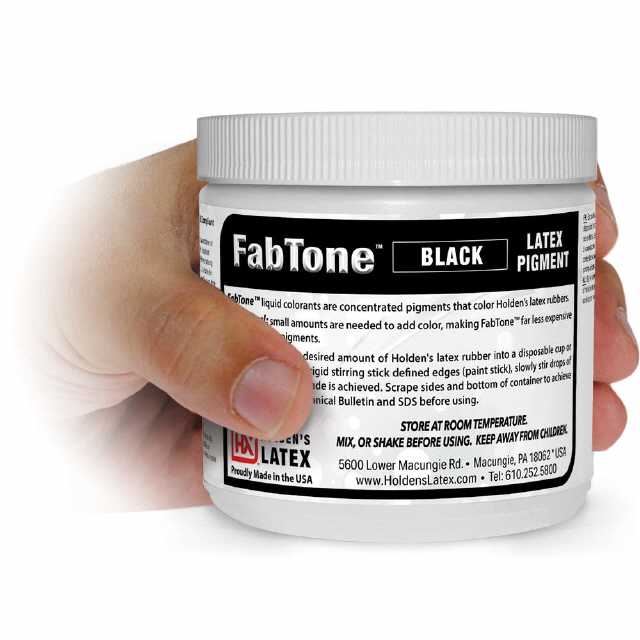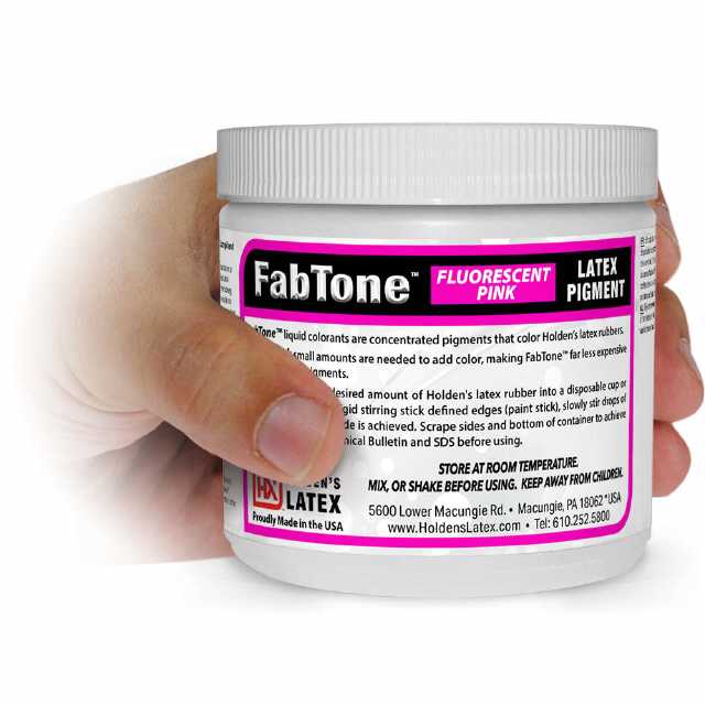 FabTone™ Latex Colorants are concentrated, latex color pigments that offer excellent dispersion and consistent color. A very small amount will color a proportionally large amount of liquid latex material. The more you add in proportion to the volume of liquid latex, the more dramatic the color effect. Recommended loading range is .3% to 10% of total system weight. Do not overload the liquid latex system or leaching may occur.