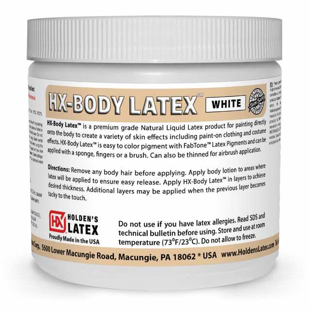 HX-Body Latex ™ es un producto de látex líquido natural de primera calidad para pintar directamente sobre el cuerpo. Tiene un alto contenido de sólidos y alta viscosidad, lo que lo hace muy adecuado para pintar sobre superficies tridimensionales o personas. Además de crear ropa y disfraces que se pueden pintar, HX-Body Latex se puede utilizar para la fabricación de máscaras, fundición deslizante, fabricación de moldes y aplicaciones de efectos especiales. HX-Body Latex ™ se puede teñir y colorear como se desee utilizando nuestros colores FABTONE. Puede diluir el HX-Body Latex ™ con aproximadamente un 1% de agua destilada para permitir que fluya a través de un sistema de aerógrafo.