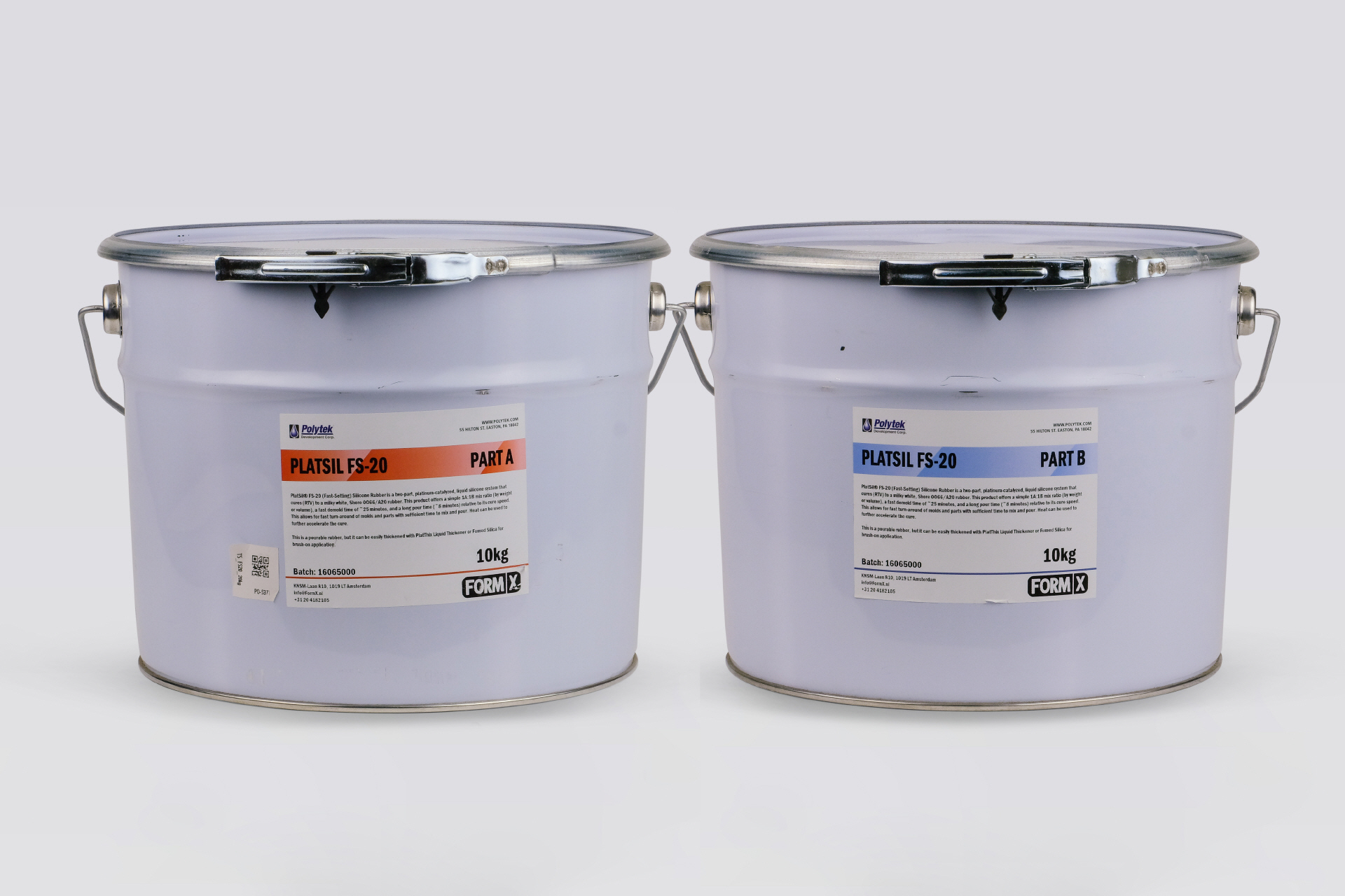 El caucho de silicona PlatSil® FS-20 (fraguado rápido) es un sistema de silicona líquida de dos componentes, catalizado con platino, que cura (RTV) hasta obtener un caucho Shore OO66/A20 blanco lechoso. Este producto ofrece una proporción de mezcla simple 1A:1B (por peso o volumen), un tiempo de desmoldeo rápido de ~25 minutos y un tiempo de vertido largo (~8 minutos) en relación con su velocidad de curado. Esto permite una rotación rápida de moldes y piezas con tiempo suficiente para mezclar y verter. Se puede usar calor para acelerar aún más el curado.